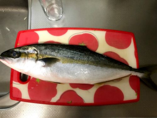 昨日、散歩のついでに立ち寄ったスーパー。いつものように魚屋をのぞいていると・・一匹のヤズがごろりと。よく見ると、ちょっと違う。値札を見るとヒラマサ。魚屋では滅多に見ない魚です。お値段は・・700円ほど。安いです。よく見ると半身とか。